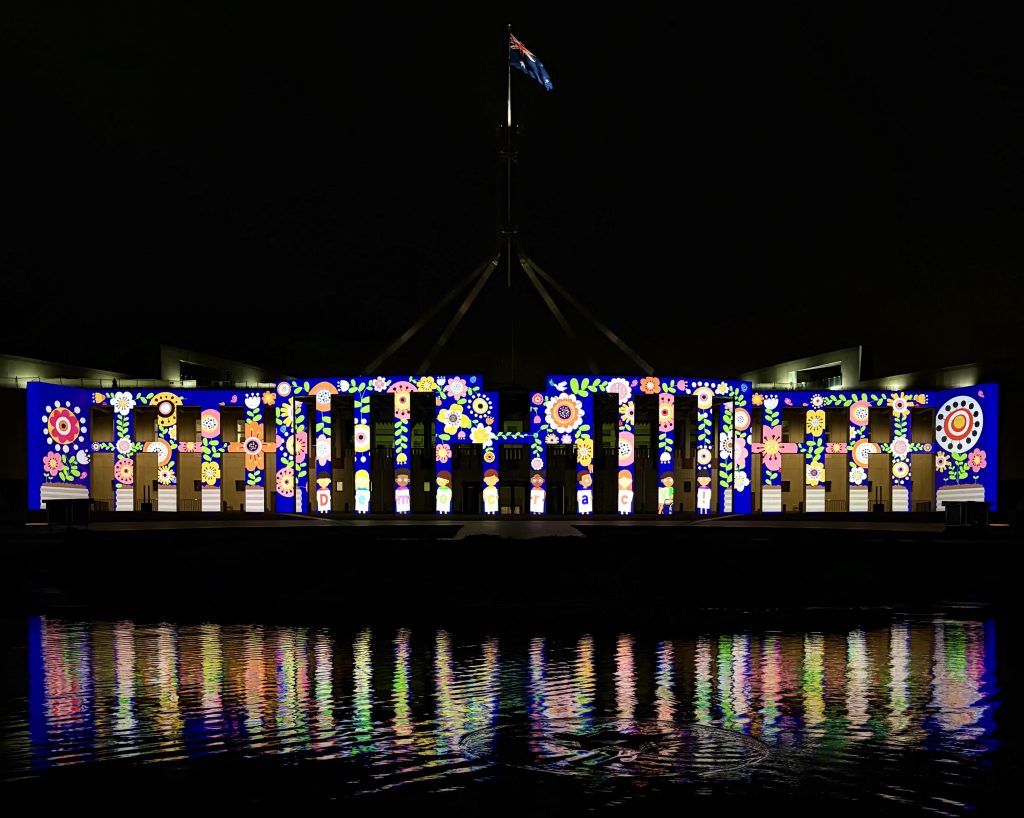 Philip is an Australian author and illustrator whose picture books encourage readers to playfully explore the edges of their understanding. His work has been published in over 40 countries and translated into almost as many languages. Inspired by Philip Bunting’s acclaimed book Democracy! – a playful, positive primer on people power – this Enlighten 2026 projection will transform the façade of Australian Parliament House into a vibrant celebration of democracy.