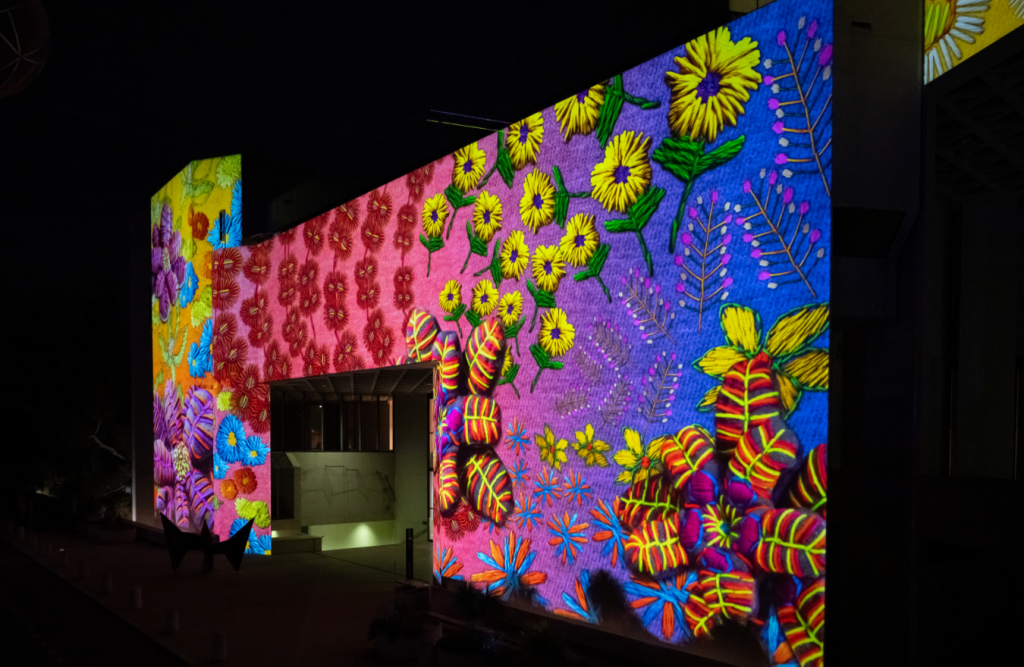 Presented alongside the 5th National Indigenous Art Triennial: After the Rain, the projection offers a sense of rich and colourful Country, that has been cleansed by rain to suggest rebirth and new beginnings. Inspired by their families, kinship relationships and the importance of rain to regenerate desert Country, this animation shares a positive and empowering message to continue moving onwards and upwards.