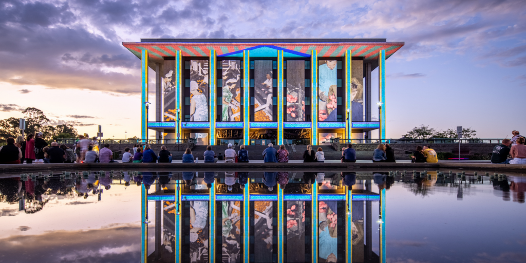 Image Description: An image of the National Library of Australia in which the façade of the library is covered in brightly covered projections. Eight columns are lit up in turquoise edged with bright yellow. The roof of the library extends out over the front façade and it lit in vertical lines alternating orange and grey lines. 7 Panels of the face of the library are filled with projections archival images from the 1950’s of people sorting apples and oranges in a factory. The building is reflected in a perfect mirror image in a pool of water at the base of the image and people are sitting at the edge of the pool looking up at the library, with their backs to us, the viewer. Behind the building the sky is a deep blue with shattered clouds as night begins to fall.