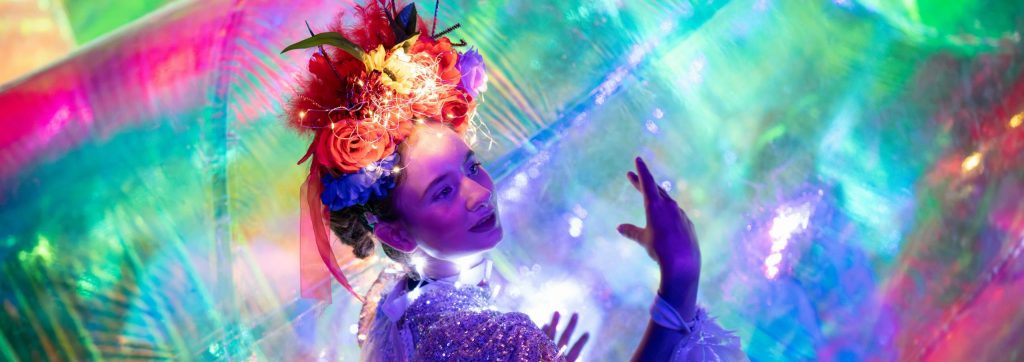 Flamingo Flock is a whimsical, flighty and enlightened foray into the flight of the flamingo. Lit by neon pink solar powered flamingos a flock of finely fashioned females will flutter through the crowds, settle into place and create a space defined by planting their feathered friends into the ground. Taking a stand and lighting the way. 6-8 performers respond to the movement of the crowds, creating a mesmeric vision of poise and performance creating magic Enlighten and immediate photographic moments to delight, engage and entertain Enlighten audiences. The lights are powered during the day by solar panels and this message of tackling climate change, drawing attention to wildlife and community connection.