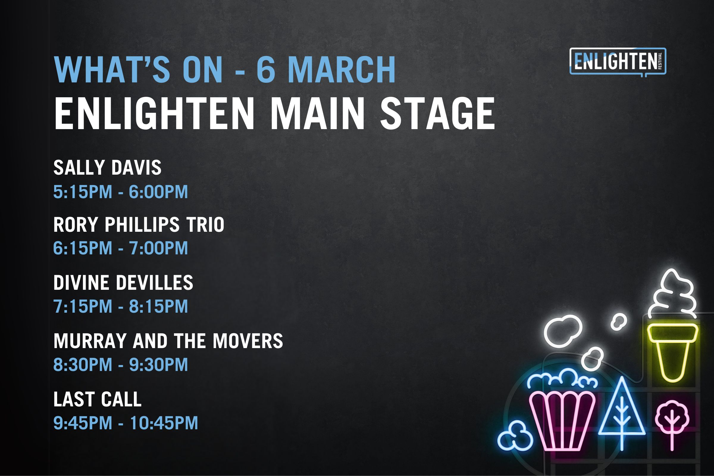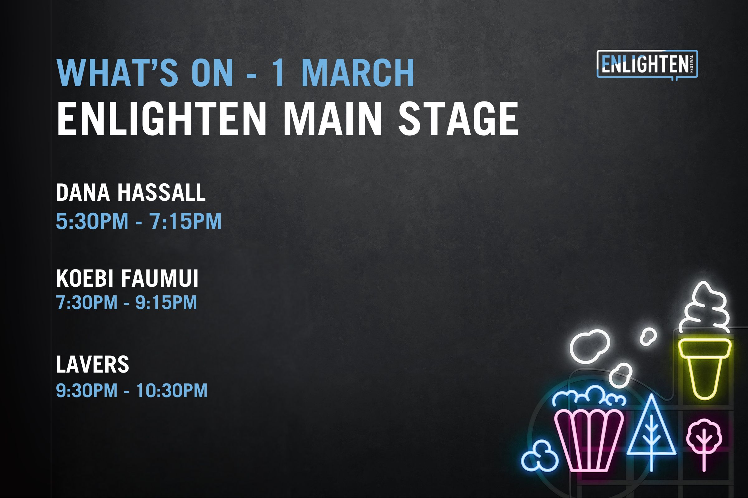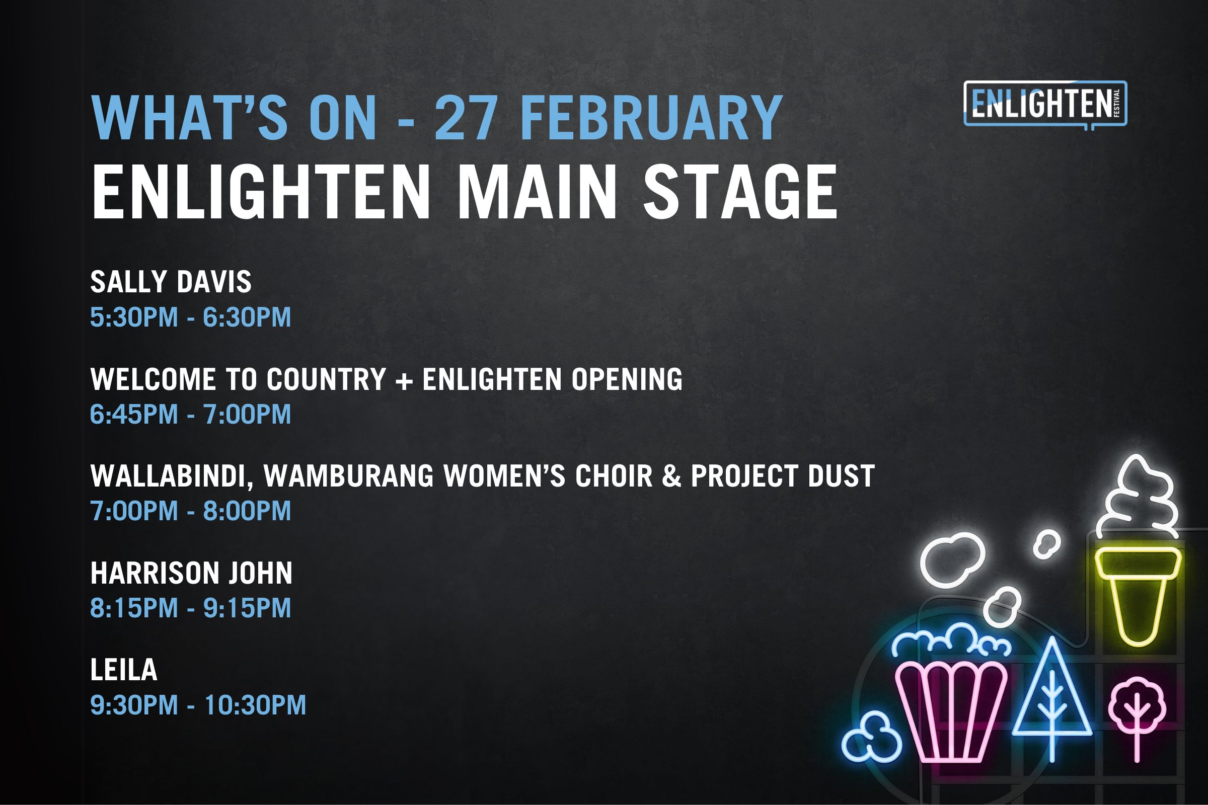 The Festival Hub will come alive each night with a curated live music program designed for all ages. Catch Murray and the Movers, led by Murray Cook, the original Red Wiggle, alongside Indigenous artists Tjaka and Lemonise, plus local favourites Koebi Faumui, Archie and the Divine Devilles. With many more artists performing across Enlighten, the Festival Hub offers a welcoming place to gather, listen and discover something new.