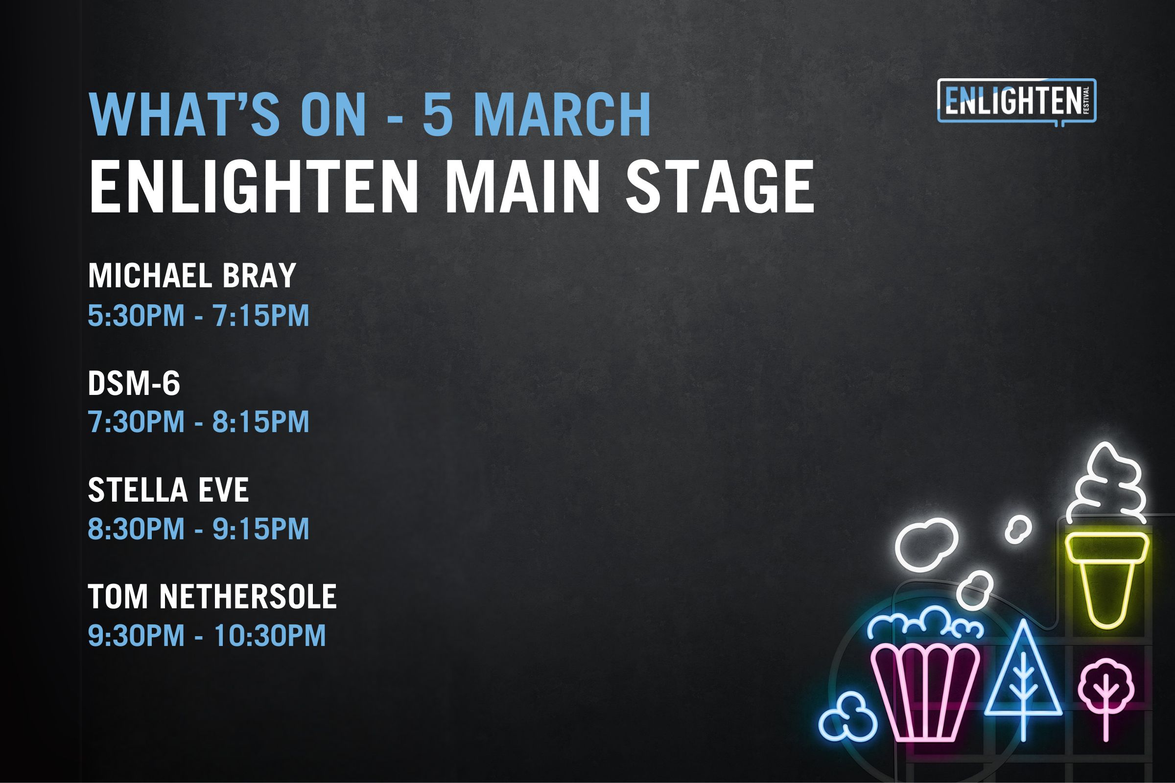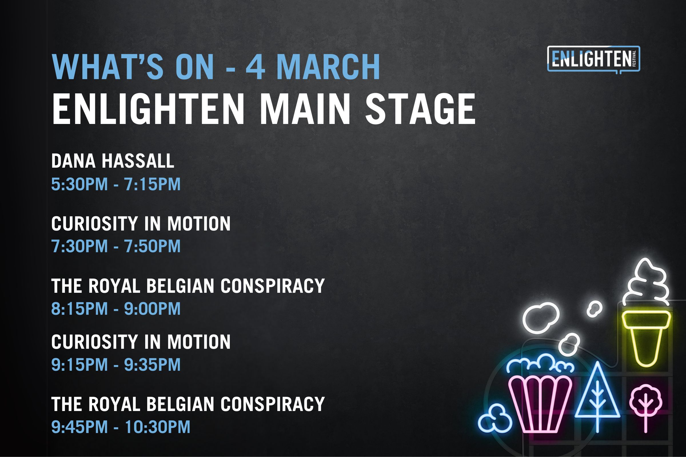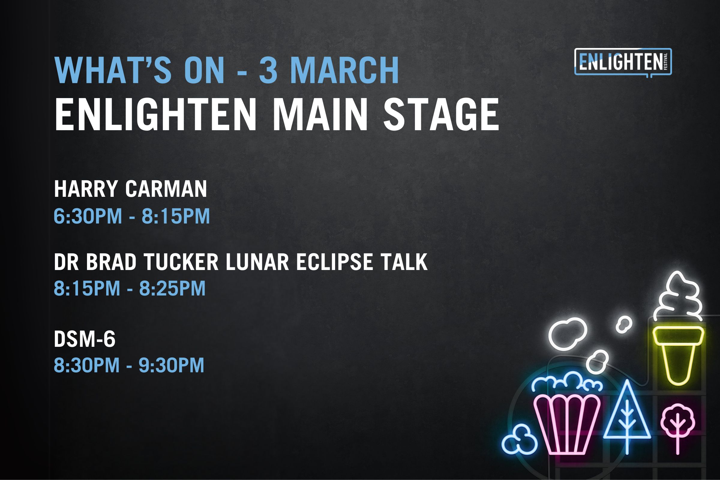 The Festival Hub will come alive each night with a curated live music program designed for all ages. Catch Murray and the Movers, led by Murray Cook, the original Red Wiggle, alongside Indigenous artists Tjaka and Lemonise, plus local favourites Koebi Faumui, Archie and the Divine Devilles. With many more artists performing across Enlighten, the Festival Hub offers a welcoming place to gather, listen and discover something new.