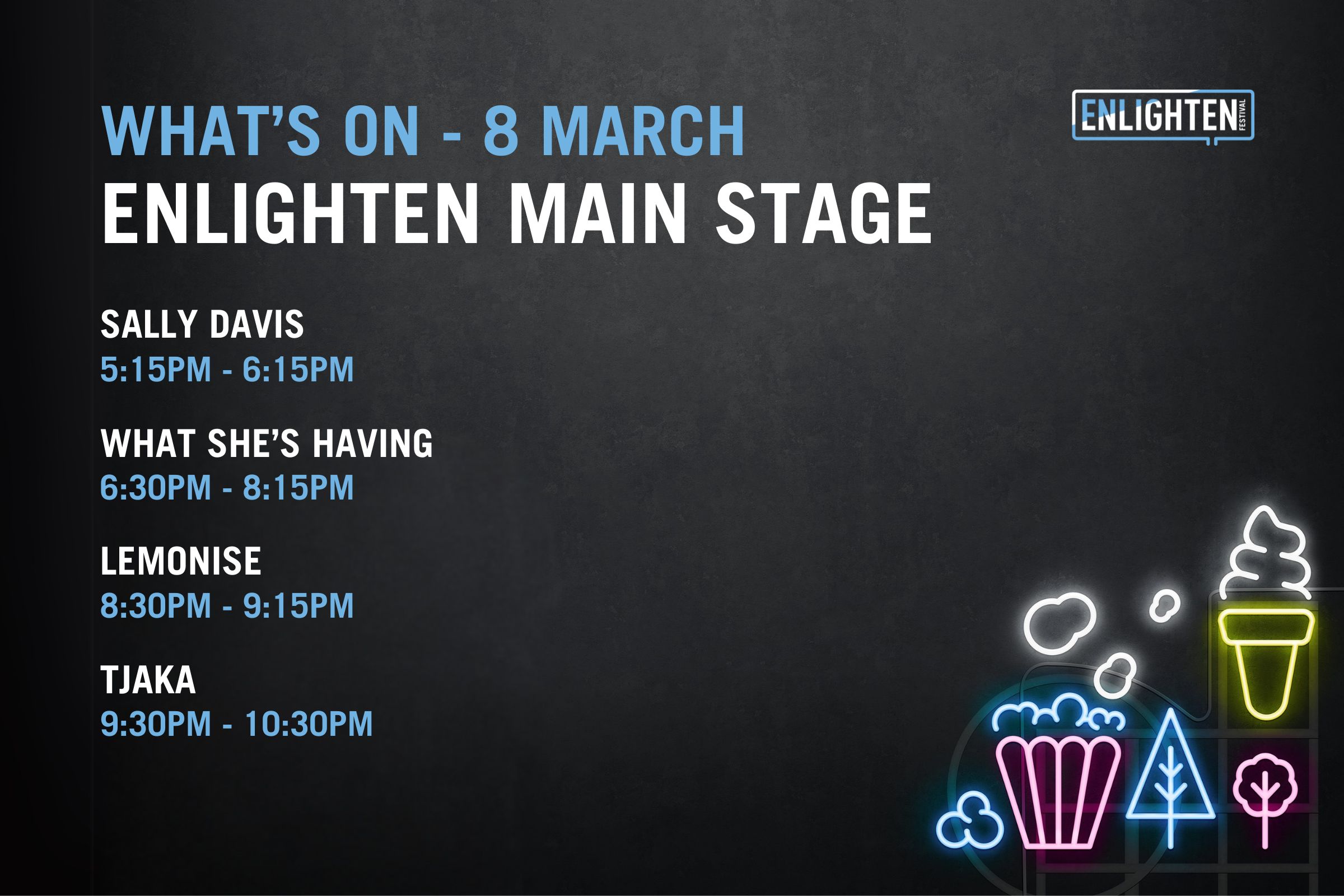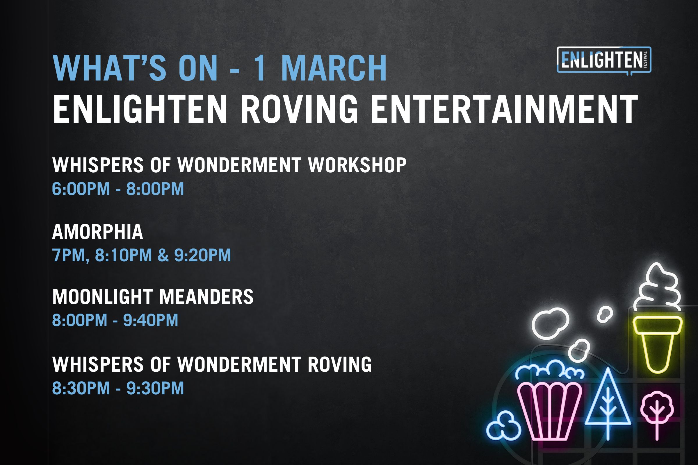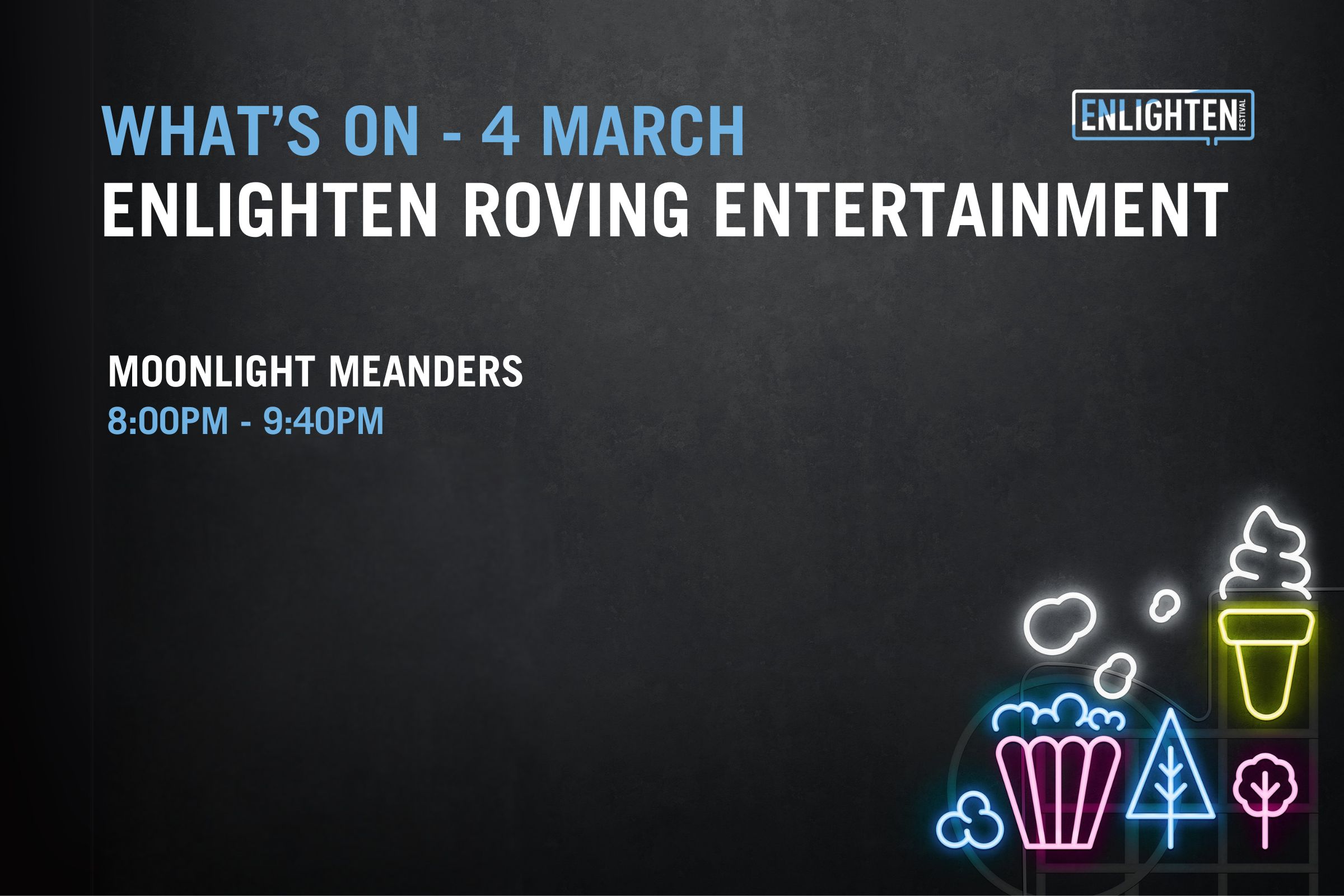 Open from 5pm-11pm each night, The Festival Hub will be the place to be during Enlighten, with installations, the bustling Food Park, local vendors, bars and a diverse lineup of homegrown talent taking to the stage each night.