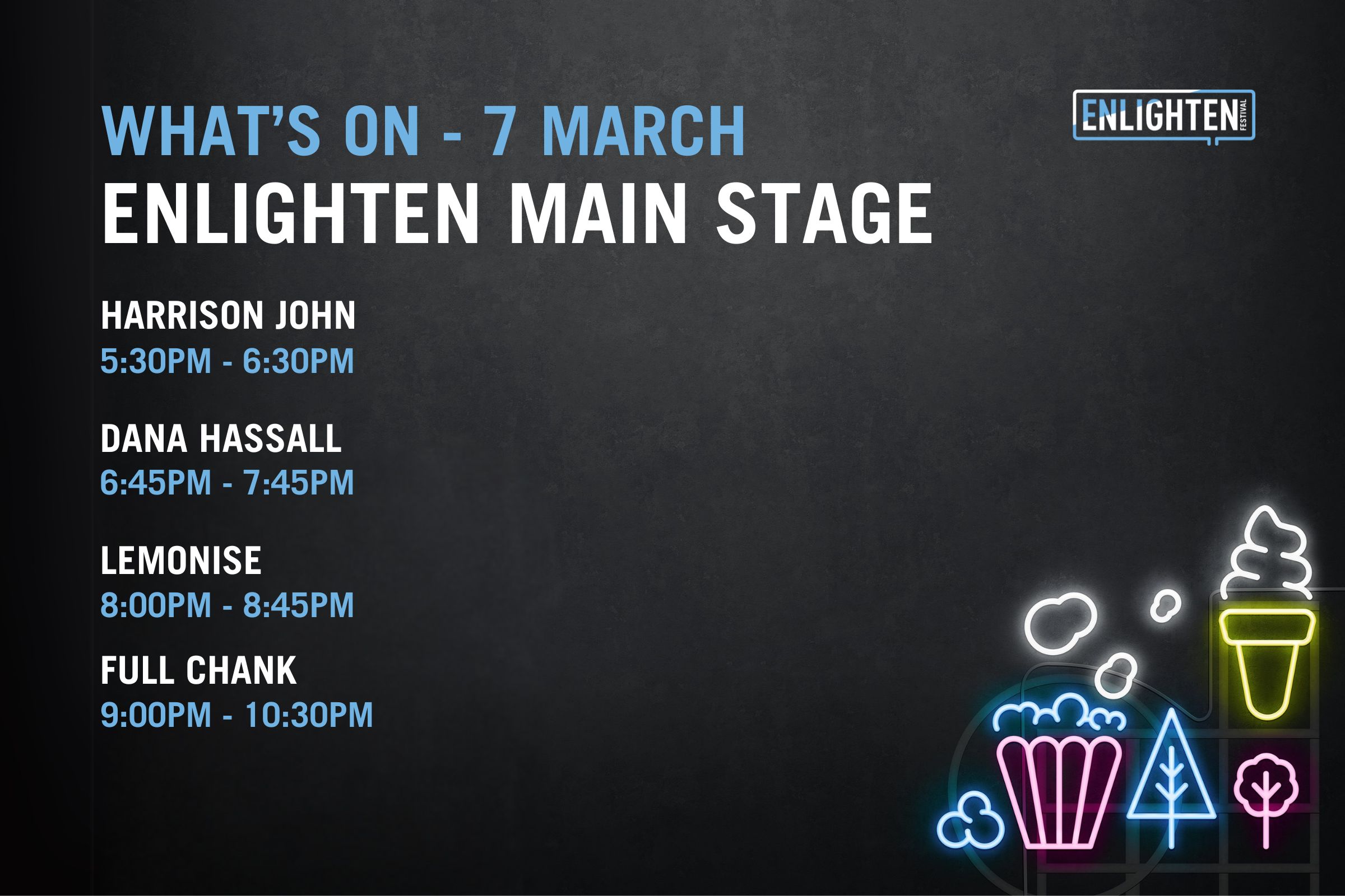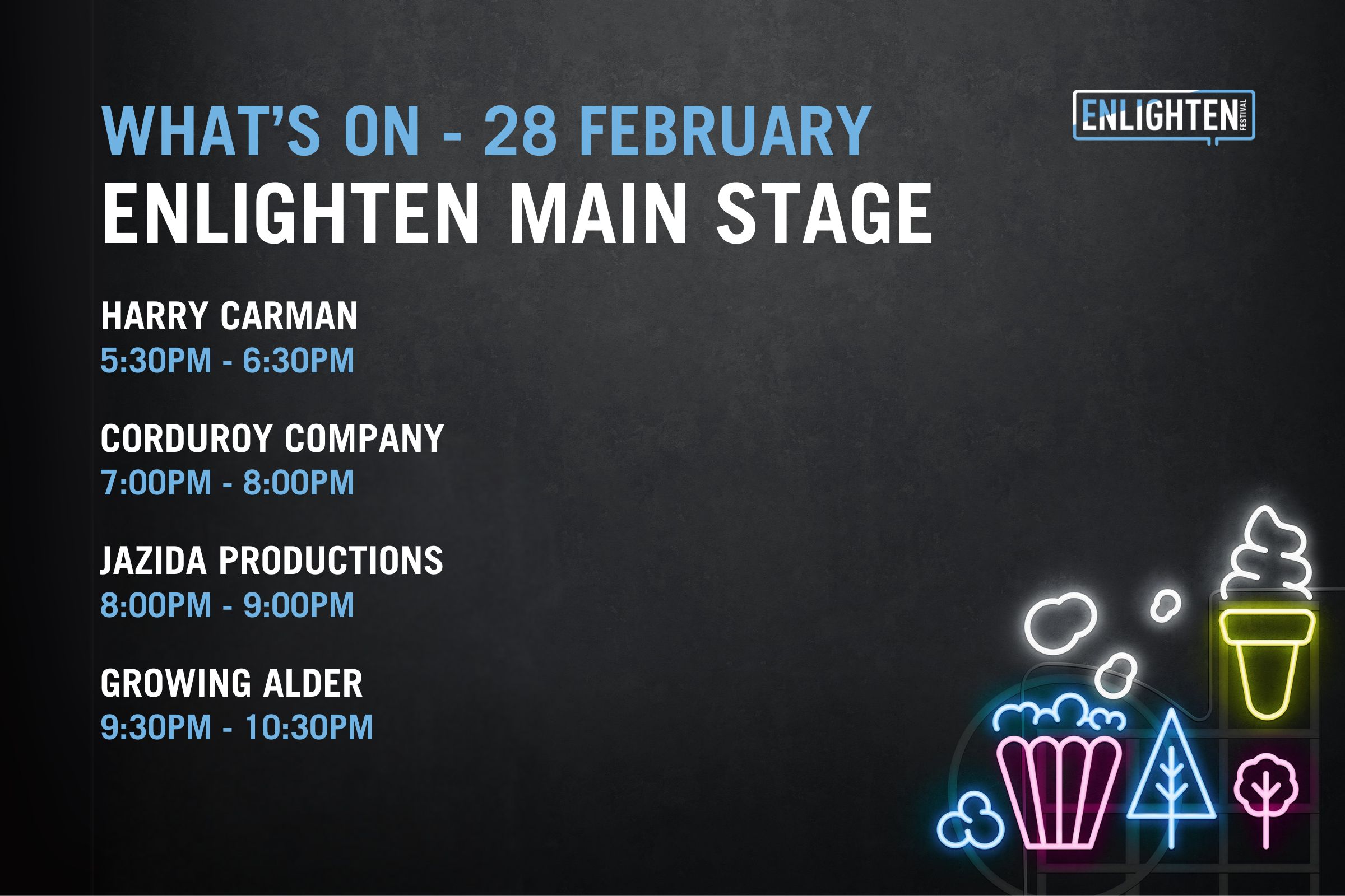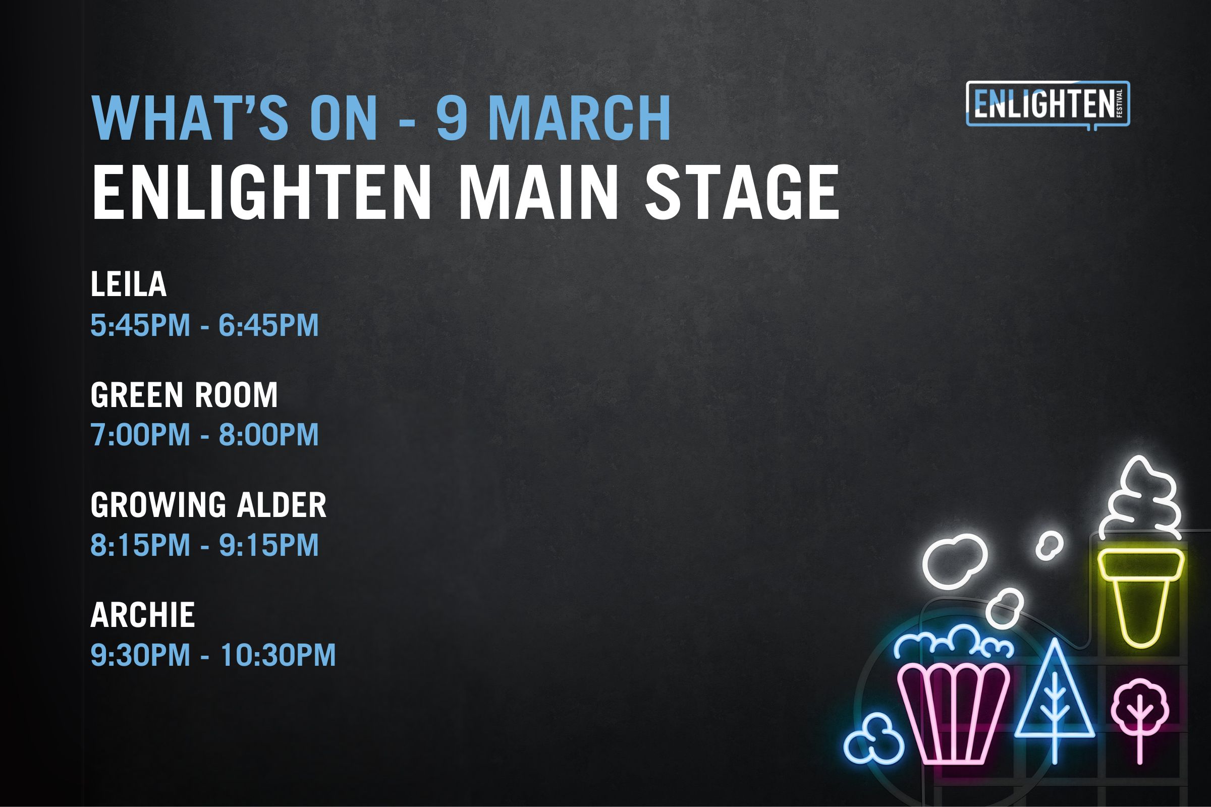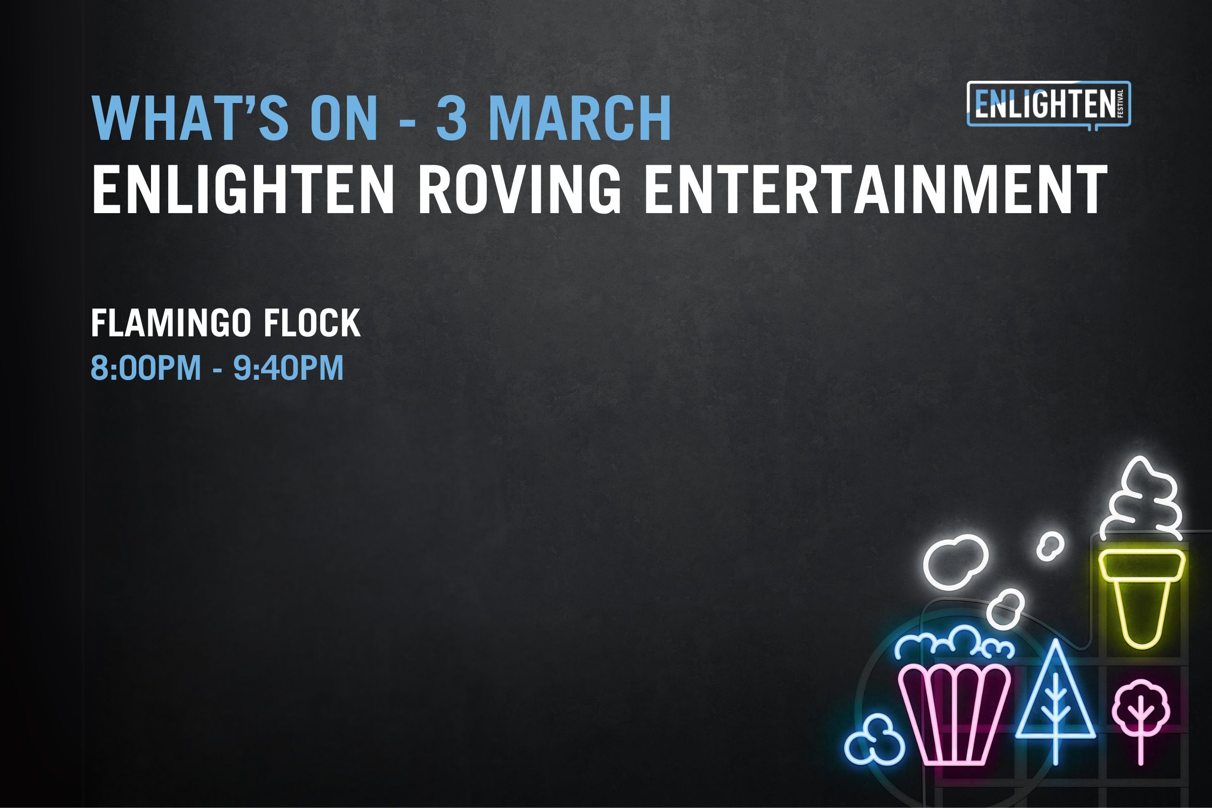 Open from 5pm-11pm each night, The Festival Hub will be the place to be during Enlighten, with installations, the bustling Food Park, local vendors, bars and a diverse lineup of homegrown talent taking to the stage each night.
